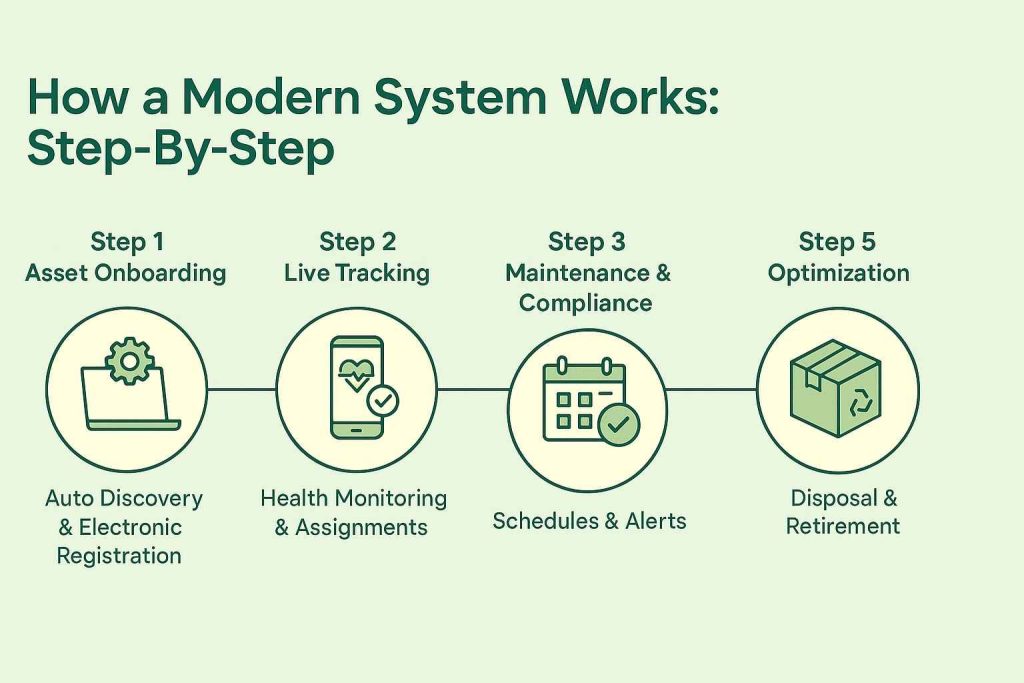 An enterprise asset management system takes a proactive, data-driven approach to managing hardware and IT assets. Below is a step-by-step process of how a modern EAM works:
