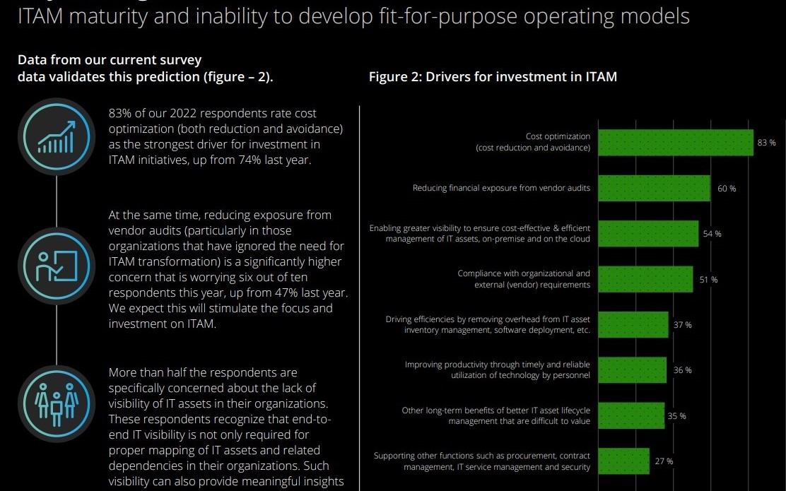 The Deloitte Global IT Asset Management Survey found that 83% of respondents rated cost optimization (both reduction and avoidance) as the strongest driver for investment in ITAM initiatives. See their key findings below: