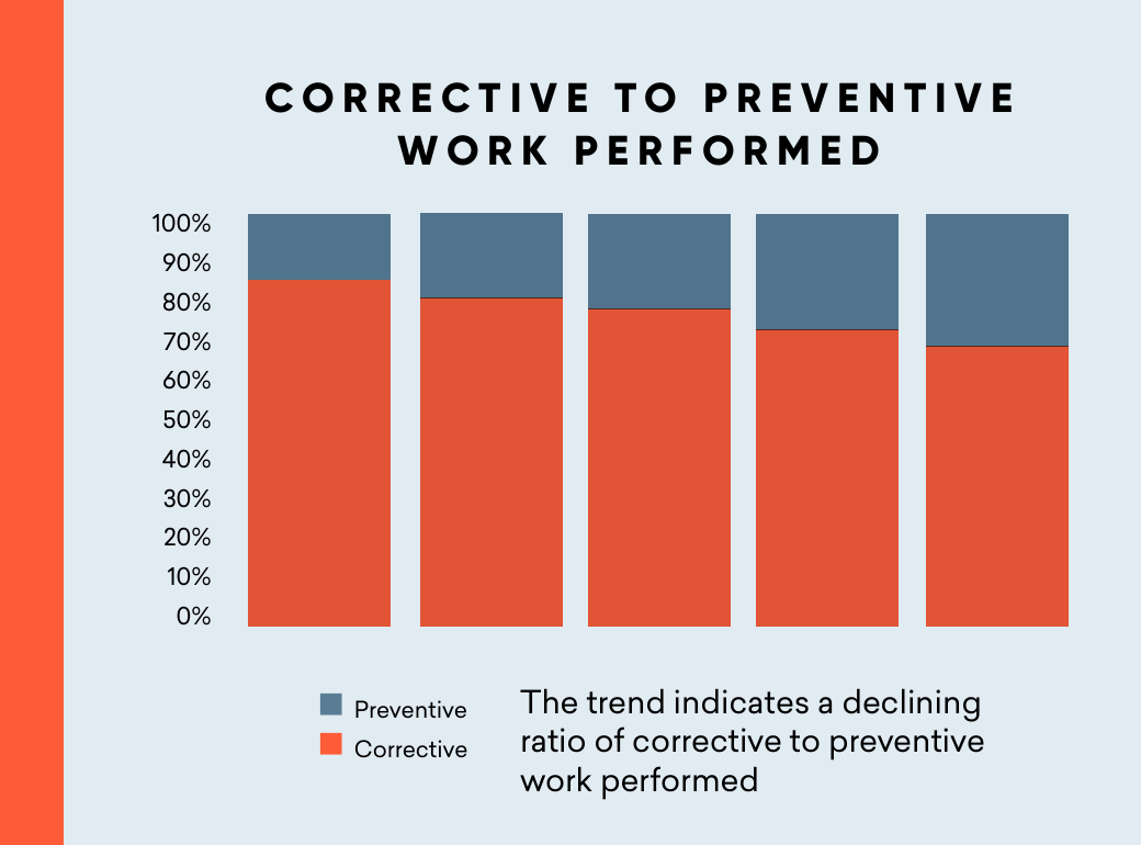The graph above illustrates the declining trend in corrective maintenance. It highlights the increasing ratio of preventive maintenance, which is highly effective in schools.